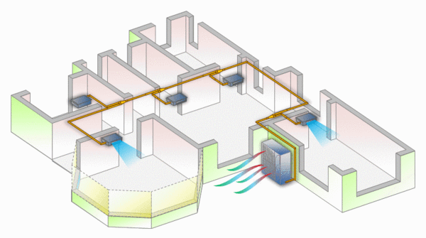 這種系統一般可由一臺室外機和4~16臺室內機組成。低檔次的是一拖四的熱泵型空調機。高檔次的配有由直流變速電動機驅動的密封型雙轉子壓縮機,也有用渦旋式壓縮機的,室內機采用電子膨脹閥,具有可同時供熱、供冷、熱回收功能的系統。其優點是各居室溫度可個別調節,另外制冷劑液體管和氣體管的直徑小、管路占用的空間小。